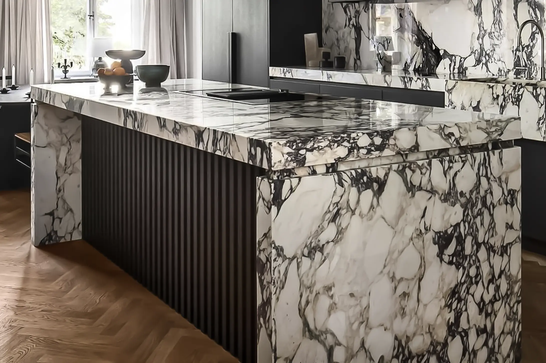 Calacatta Viola Marble Island with waterfall sides and recessed edge Countertop and backsplash Natural Stone Material: Marble Color Family: Gray, Taupe, White Application: Bathroom, Bar Tops, Fireplace, Kitchen, Outdoors